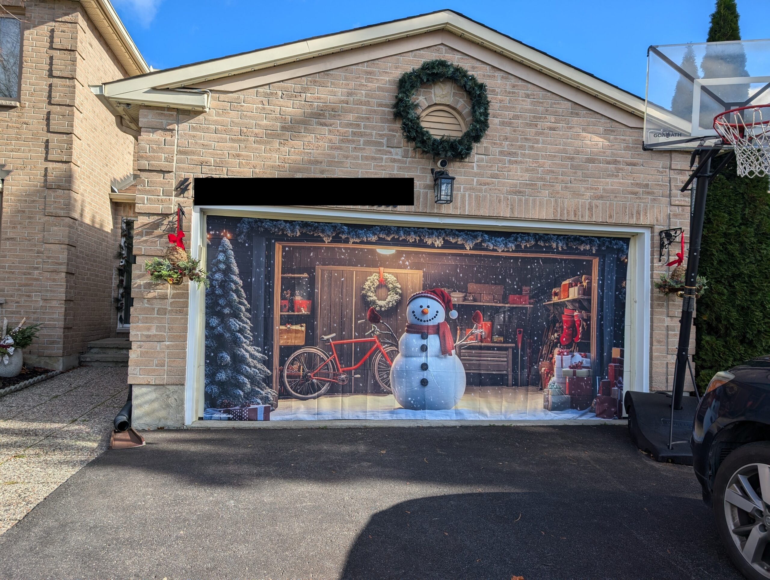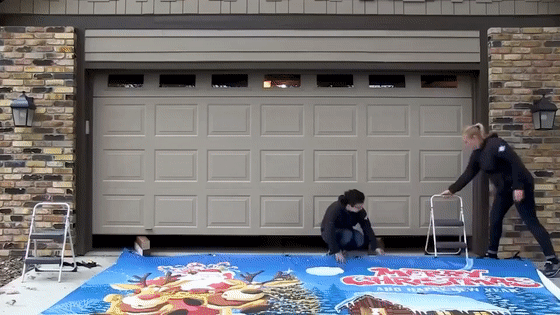 Then, hook the elastic bands to the second hinge behind your garage door, and voilà! You’re ready to show off a festive garage door cover that instantly spreads holiday cheer.
