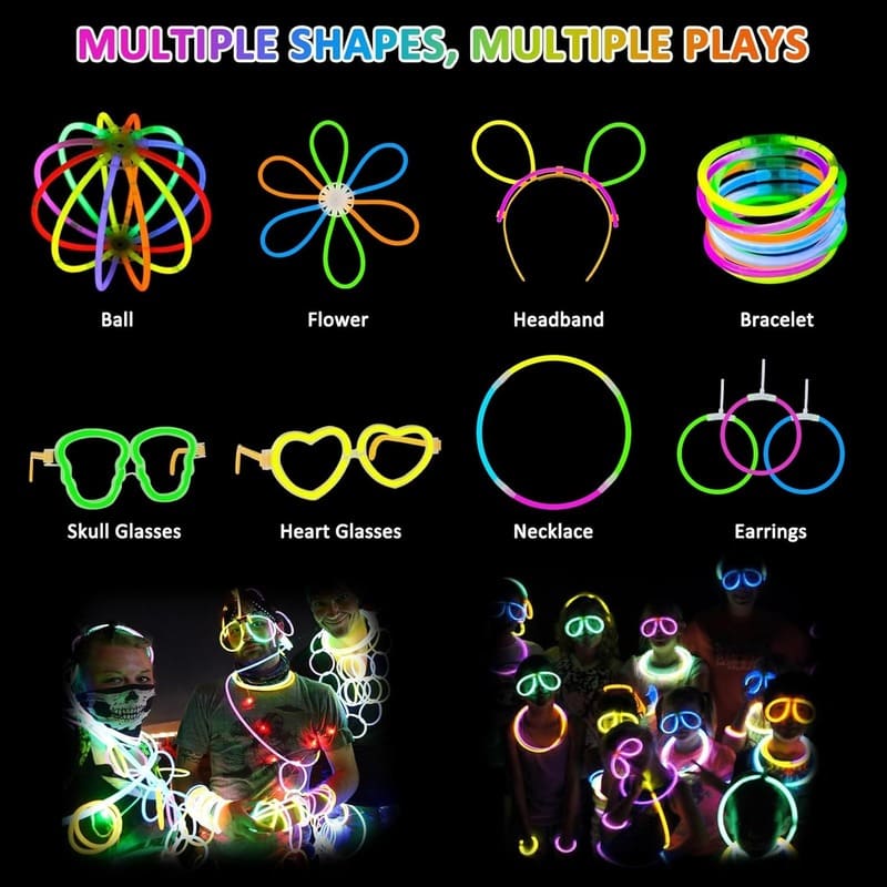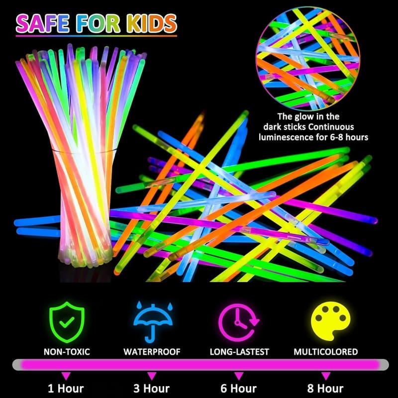 Each set includes 100 vibrant sticks in an assortment of bold colors, plus 100 durable connectors so you can create glow bracelets, necklaces, eyeglasses, crowns, even glowing jump ropes! 🌈🔗 The fun doesn’t stop at snapping them… it begins there. Build, bend, connect, and wear your glow with pride.