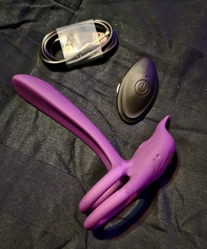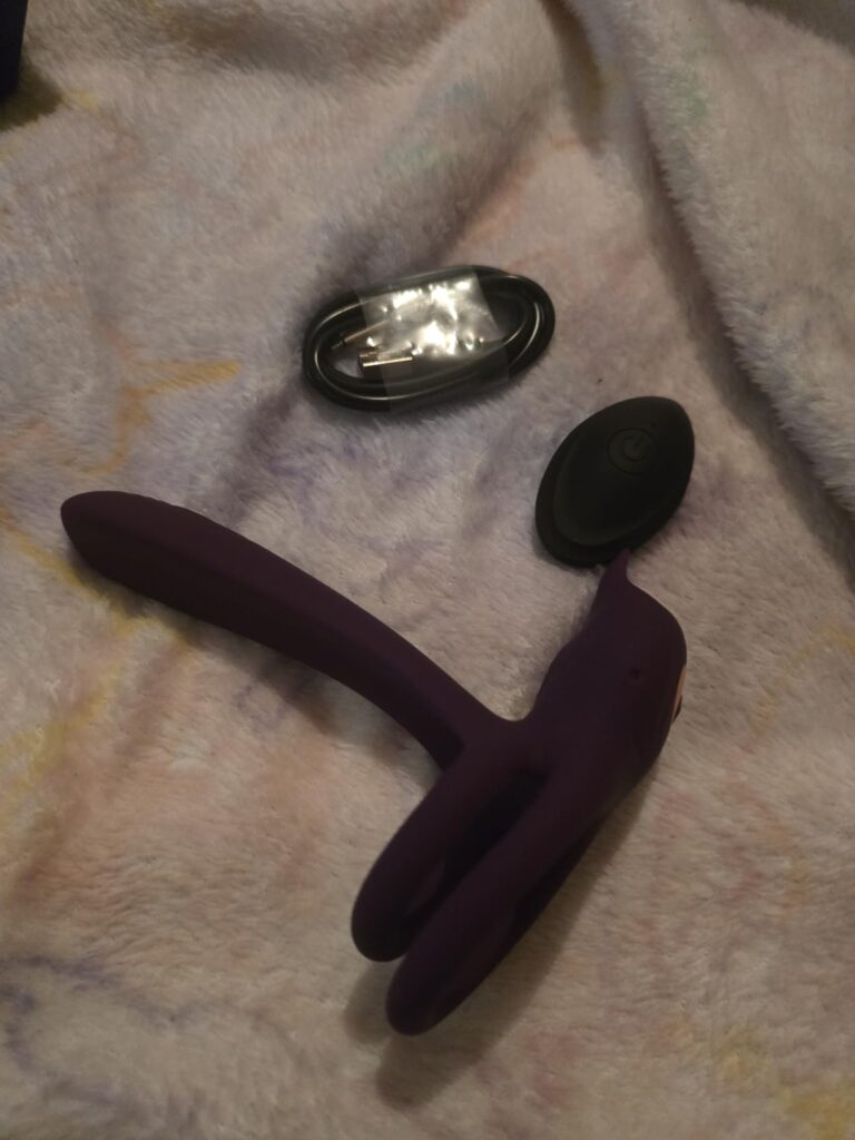 This toy has is amazing. Has two vibrating pieces, that give you vibes throughout. Remote allows either partner to control the toy. We love it!!!